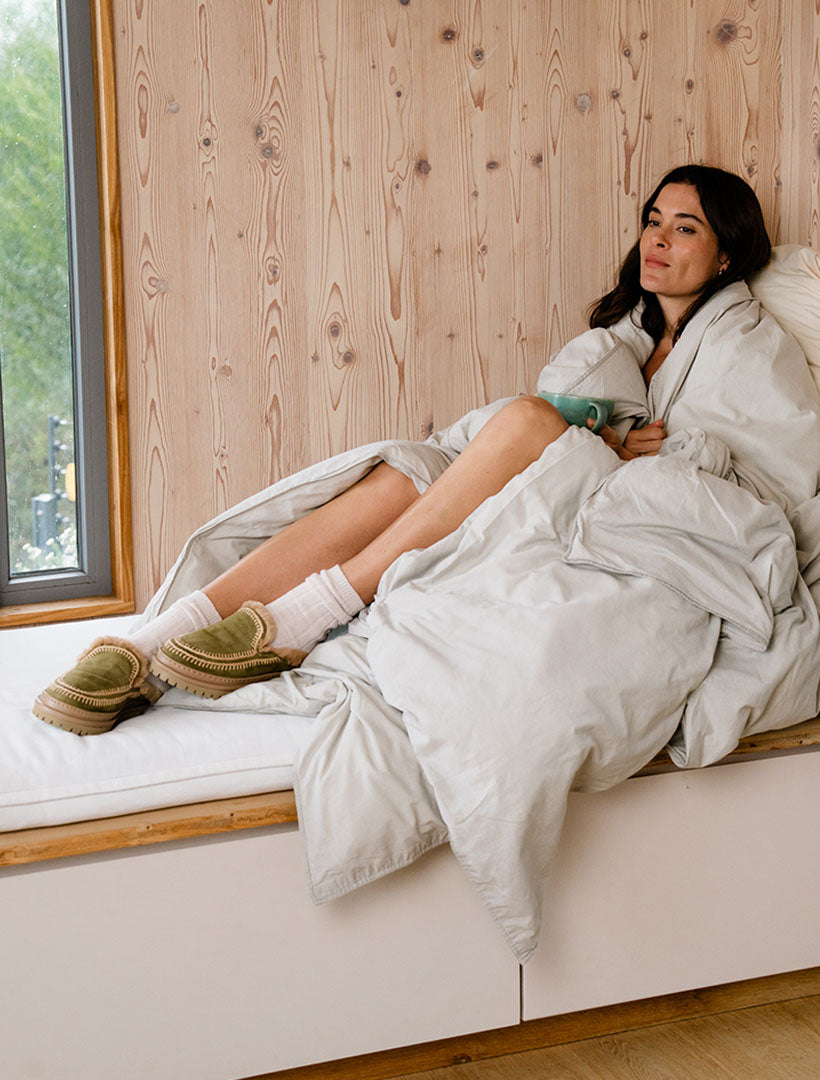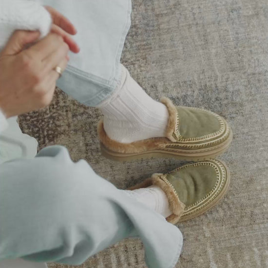 Designed for ease and warmth, the Jun 4.0 slipper in fern suede features contrast hand crochet detailing and a soft shearling interior. Set on a flexible EVA rubber sole, it combines traditional craftsmanship with quiet functionality.