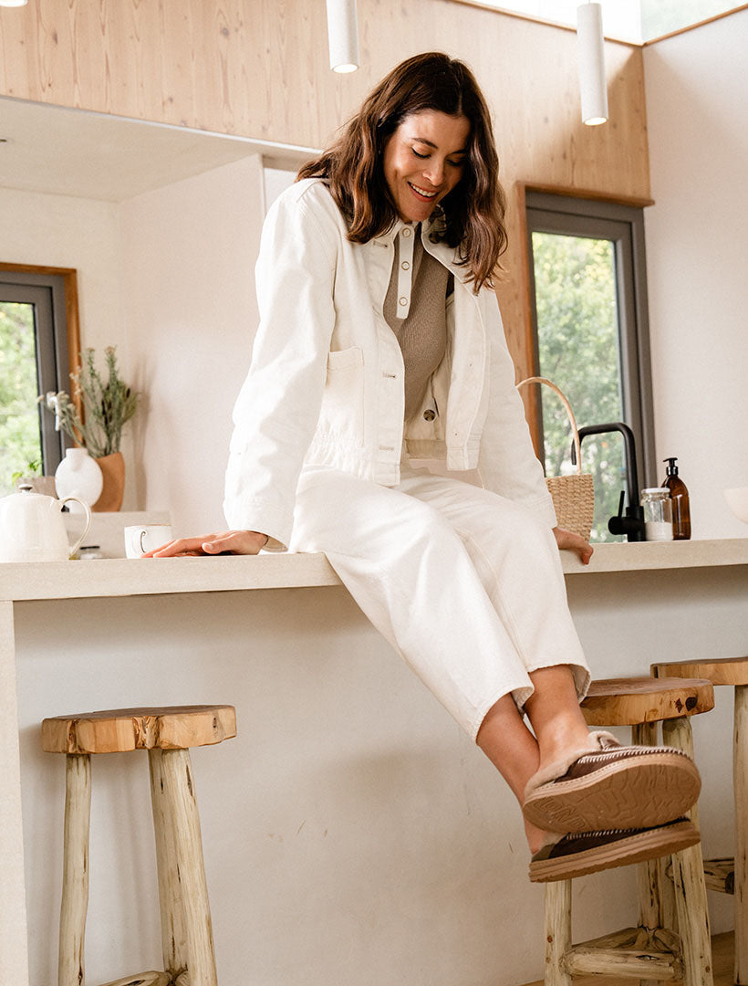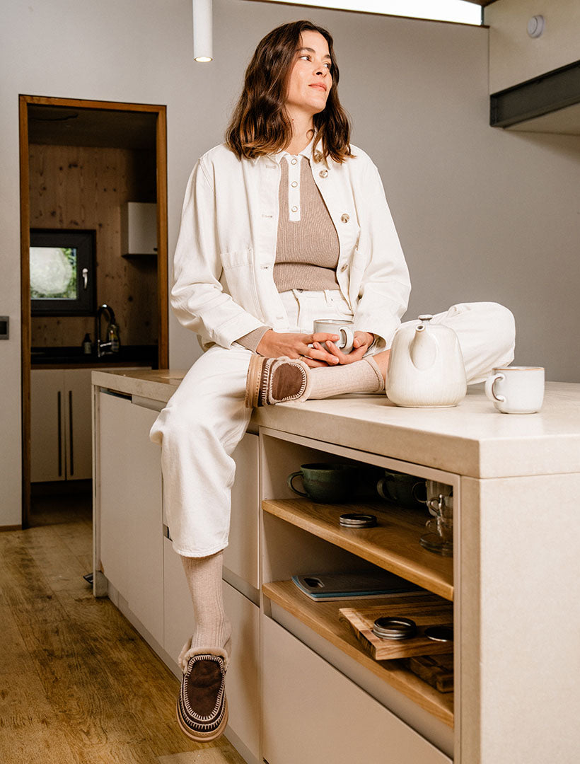 The Jun 4.1 slipper keeps things minimal and refined. Made from rich chocolate suede with wheat-toned crochet, it’s lined in warm shearling and grounded with a slim branded rubber outsole — perfect for lounging or low-key days on the move.