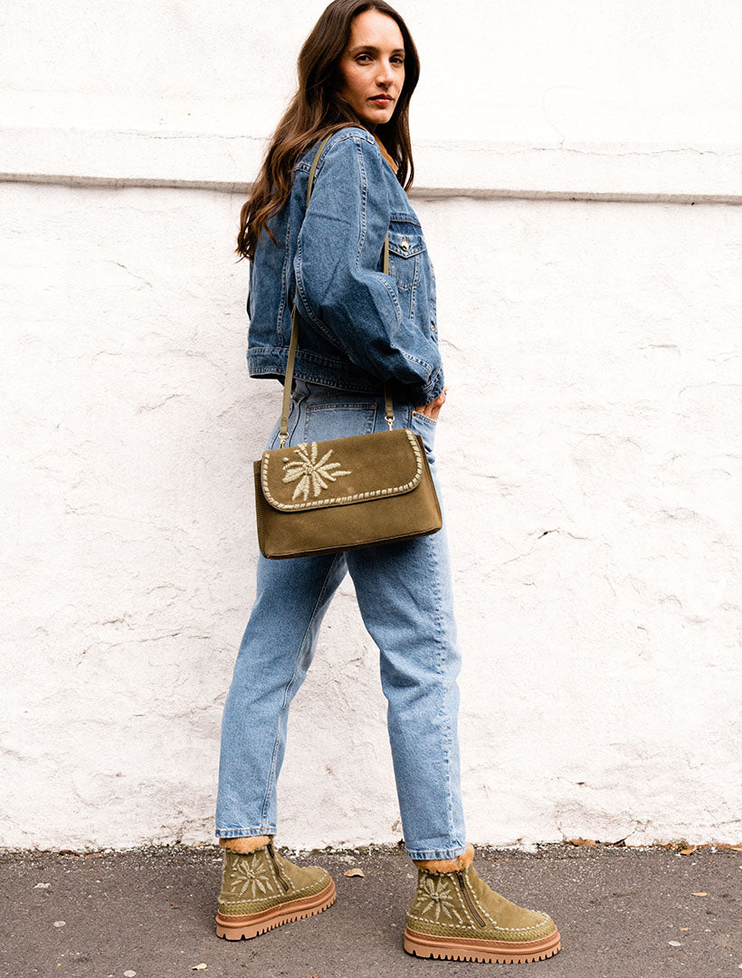 The Setsu 4.0 in Fern Suede with Olive stitching brings a fresh twist to our iconic ankle boot – crafted in soft goat suede and finished with embroidered floral accents for artisan texture and warmth.