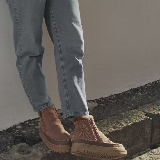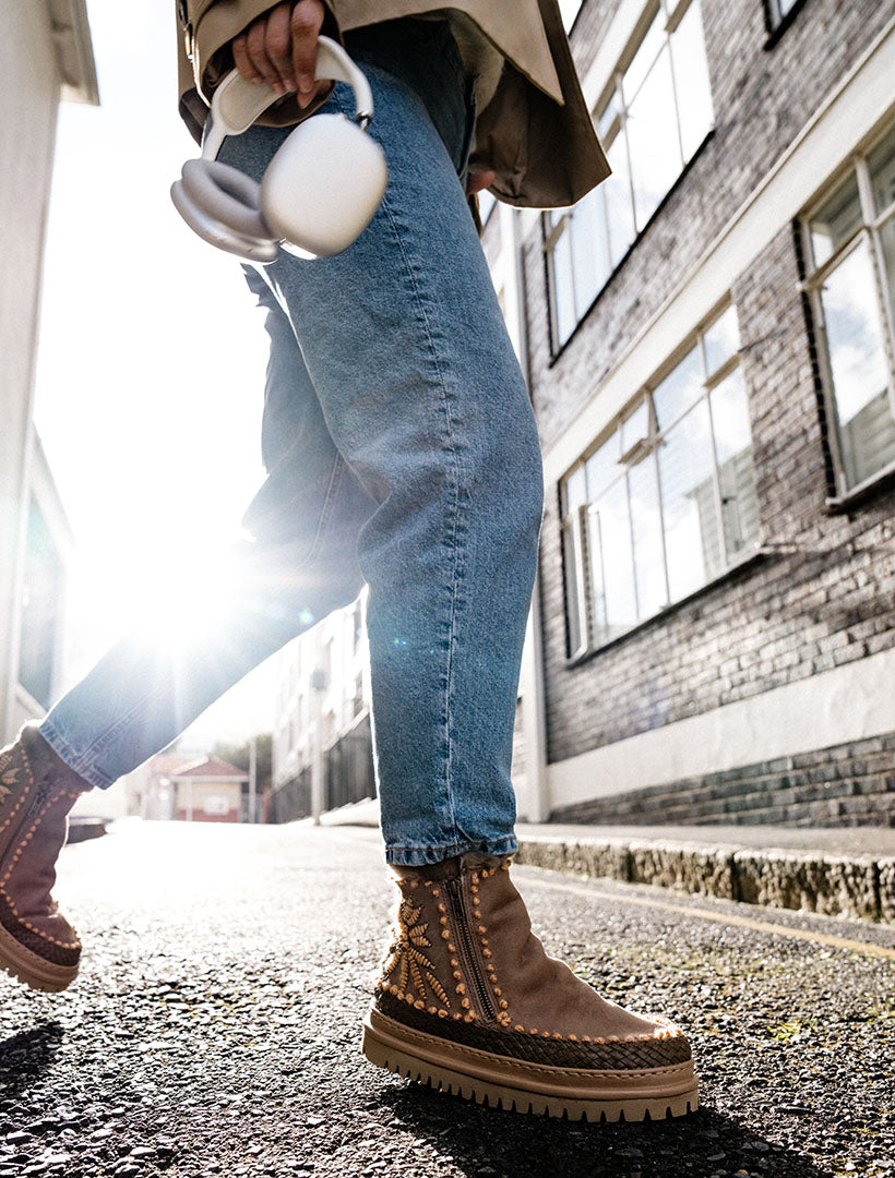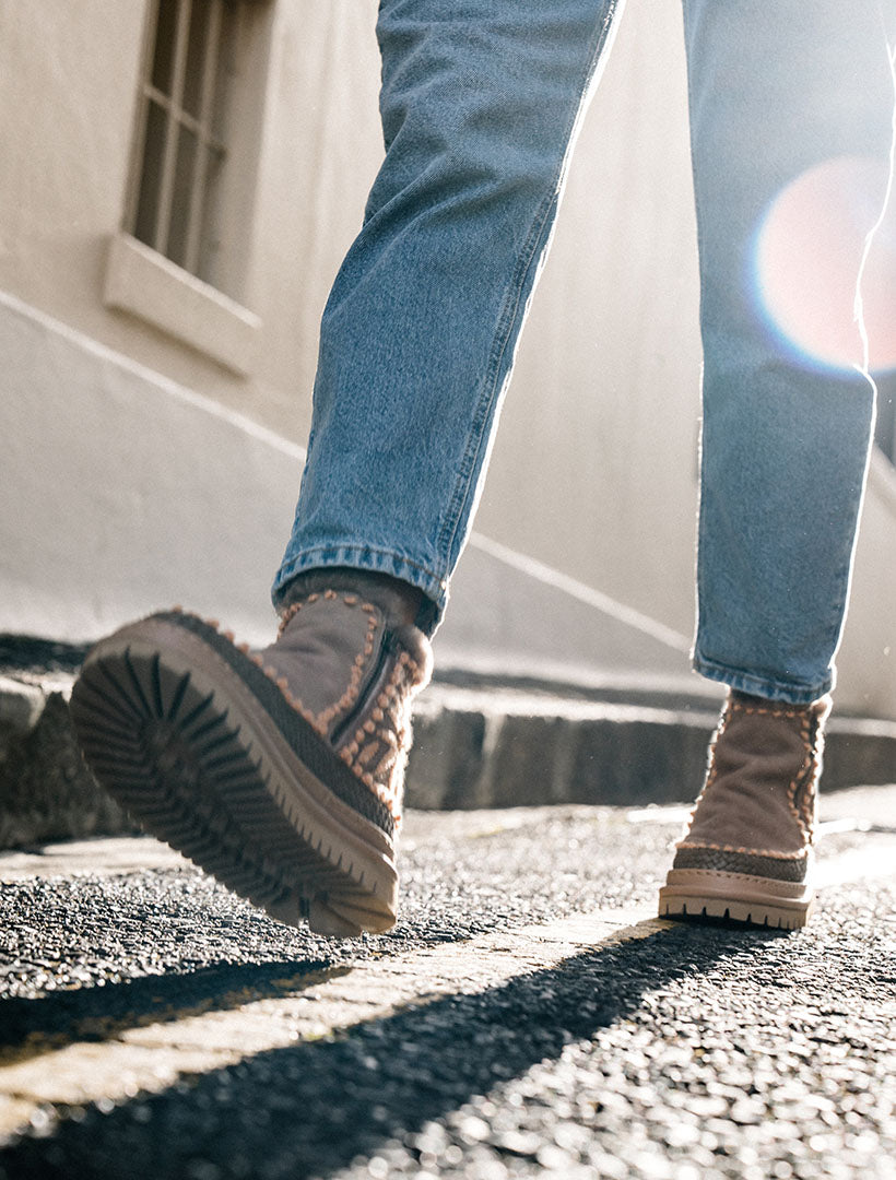 Setsu 4.0 reimagines our signature ankle boot with soft suede, bold detailing, and a modern chunky sole. Artisan-crafted with hand crochet accents or embroidered floral motifs, each style is finished with plush shearling for warmth and comfort. The lightweight rubber outsole adds flexibility and grip, perfect for colder days on the move.