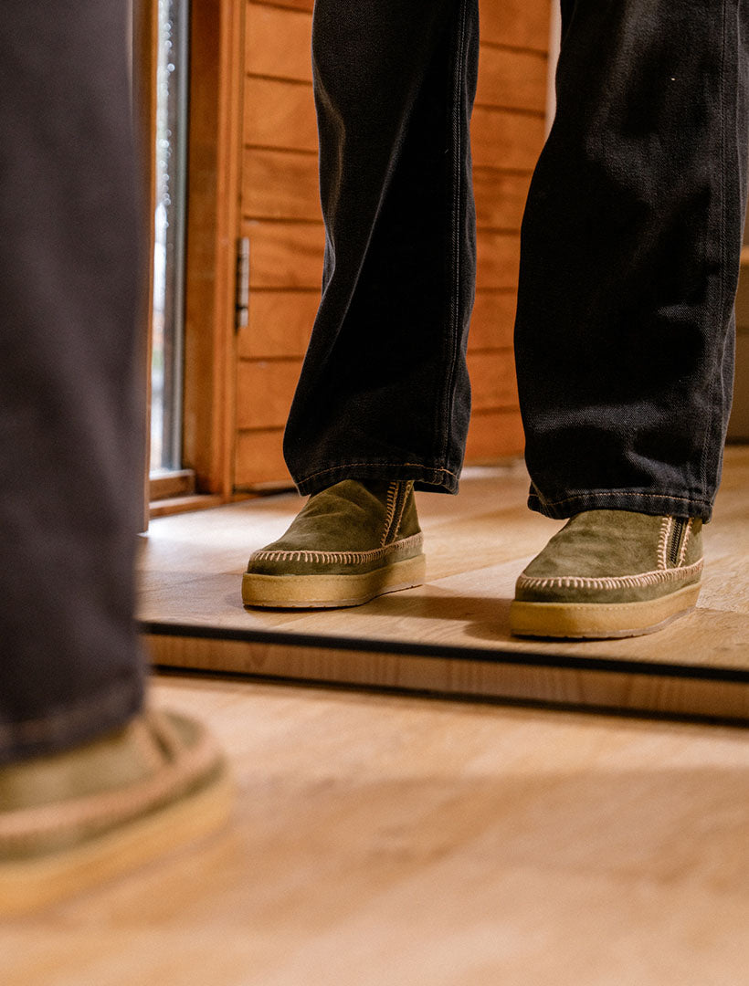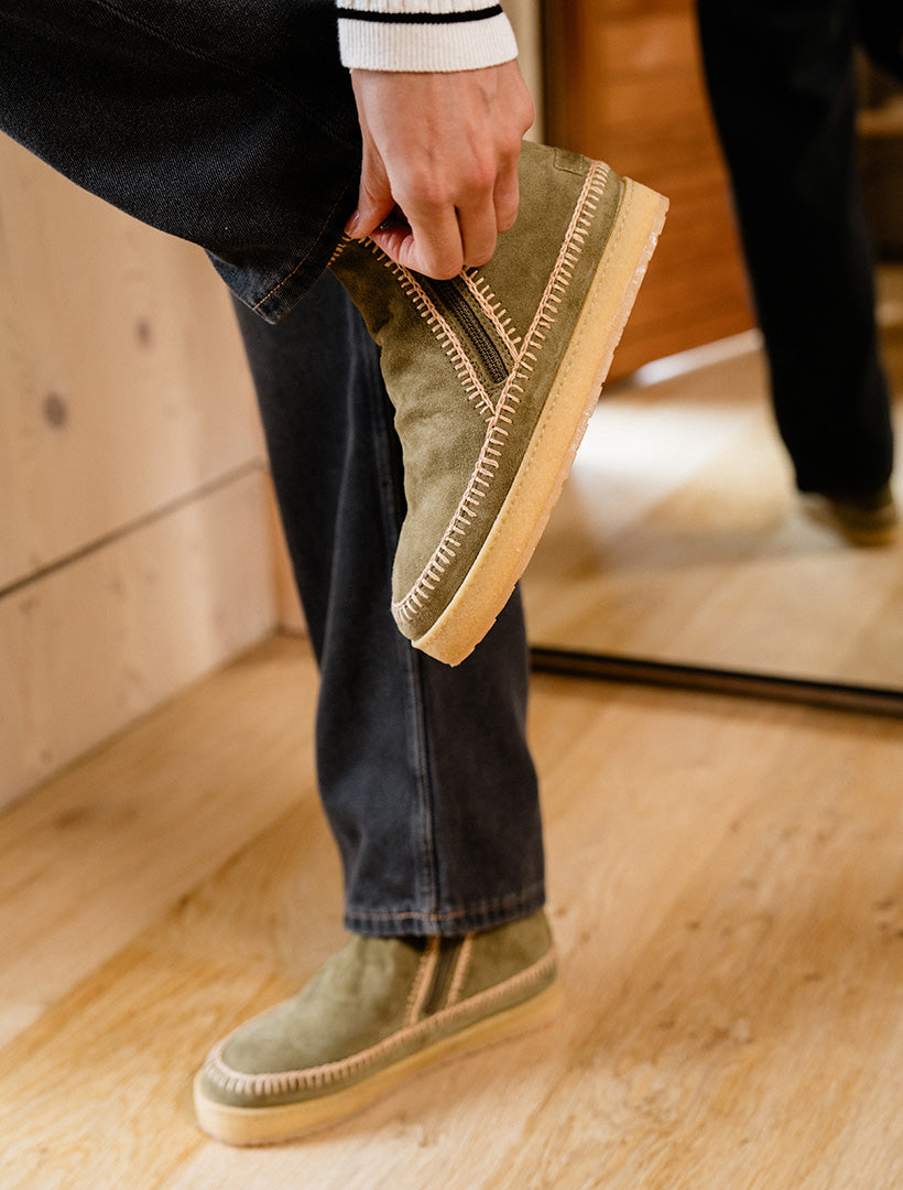 The Setsu Crochet Ankle Boot in Fern Suede with Beige stitching blends artisan detail with everyday ease – a handcrafted suede boot lined with soft shearling, perfect for colder days.