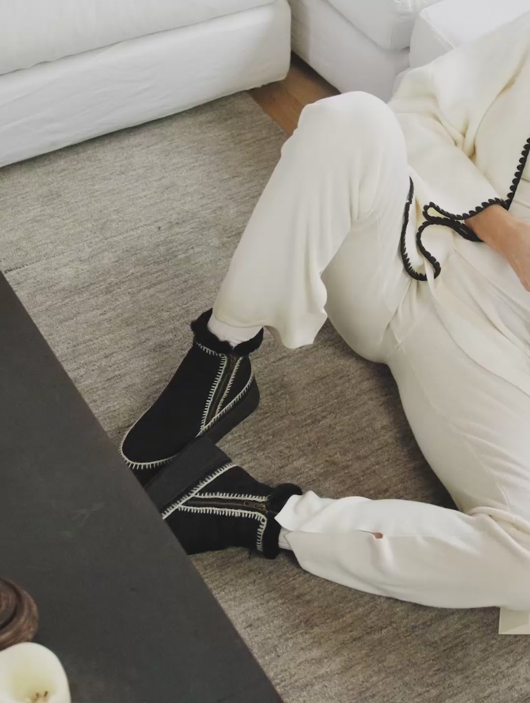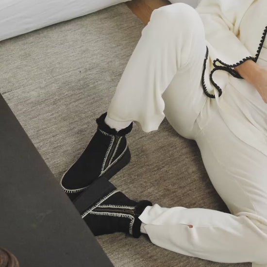 A fresh take on a laidback icon, the Setsu Platform adds height without compromising comfort. Handcrafted in soft goat suede with hand-crocheted stitching, this elevated style is fully lined in cosy shearling and grounded with a sculpted crepe-blend outsole. Designed to lift your look and keep you grounded wherever the day takes you.